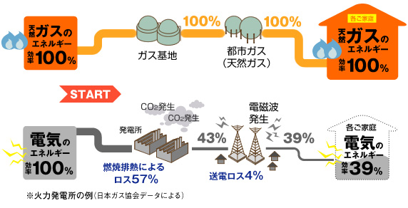 エネルギーの大半を輸入に頼る日本においては、それをできるだけ無駄なく利用することが重要です。天然ガスは、ガス導管を通じてお客さまのもとへ届くため、製造からご家庭に届くまでのエネルギーロスは限りなくゼロです。一方、電気は発電ロスや送電ロスが生じるため、60%以上のエネルギーを失います。だから、天然ガスは、高効率かつ省エネなのです。