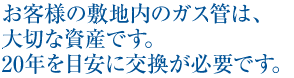 お客様の敷地内のガス管は、大切な資産です。20年を目安に交換が必要です。