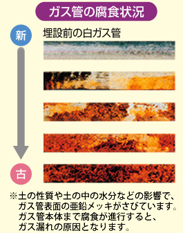 屋内や屋外で露出しているガス管はきれいに見えても、土の中に埋められたガス管(亜鉛メッキ鋼管)は、一般的に年を経るとともに腐食が進行しています。