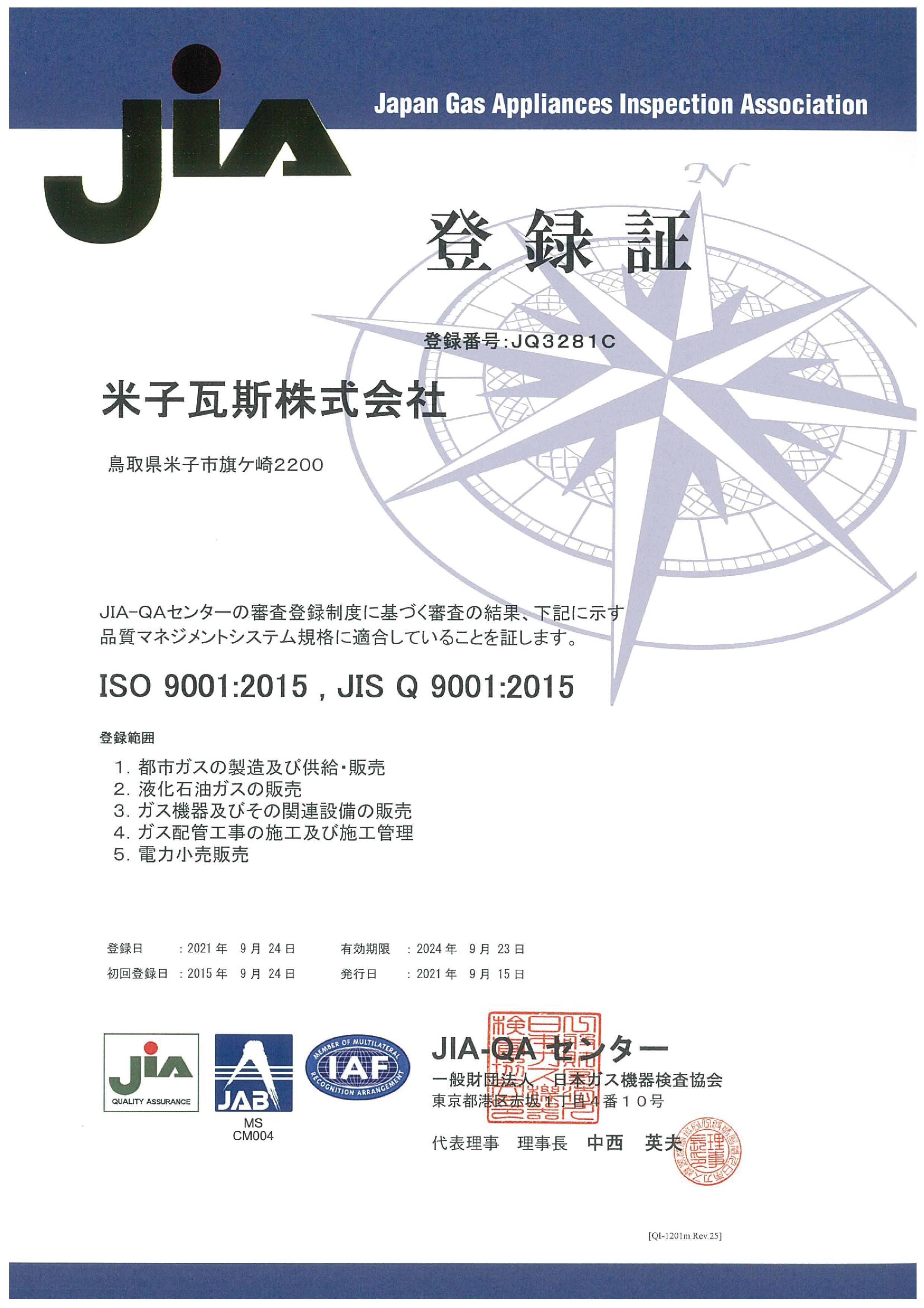 | このたび当社は、品質マネジメントの国際規格である「ISO9001」の認証を取得いたしました。 お客様の安心・安全を守るために仕事の品質を向上させ、快適な暮らしに貢献し続けていけるよう社員一丸となって努力してまいります。 ・取得サイト 米子瓦斯株式会社 ・取得までの経緯 2014年10月 キックオフ 2015年4月 運用開始 2015年7月 第一段階審査 2015年8月 第二段階審査 2015年9月24日 認証取得 2018年9月24日 更新 2021年9月24日 更新 2024年9月24日 更新 |
