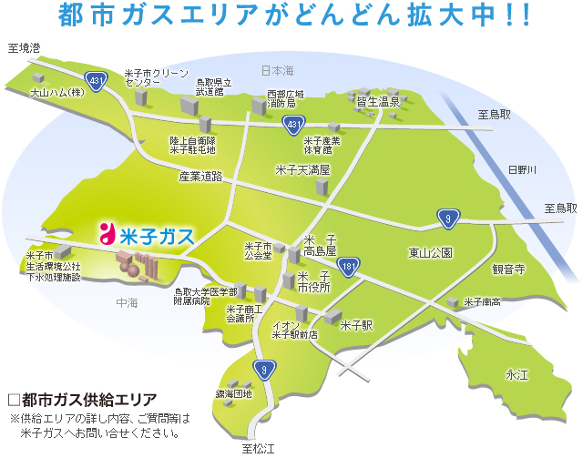 米子ガスは、91年間にわたり地域の発展と共に成長し、地域に密着したガス事業を展開してまいりました。現在では家庭用を中心に、商業用、工業用、そのほか病院や官公庁などの幅広い分野において、環境性と将来性を兼ね備えた「天然ガス」を都市ガスとしてお届けしています。また、都市ガスを供給できない地域の皆様には「LPガス」をご利用いただき、鳥取県西部の広範囲にわたってガスをお届けしています。