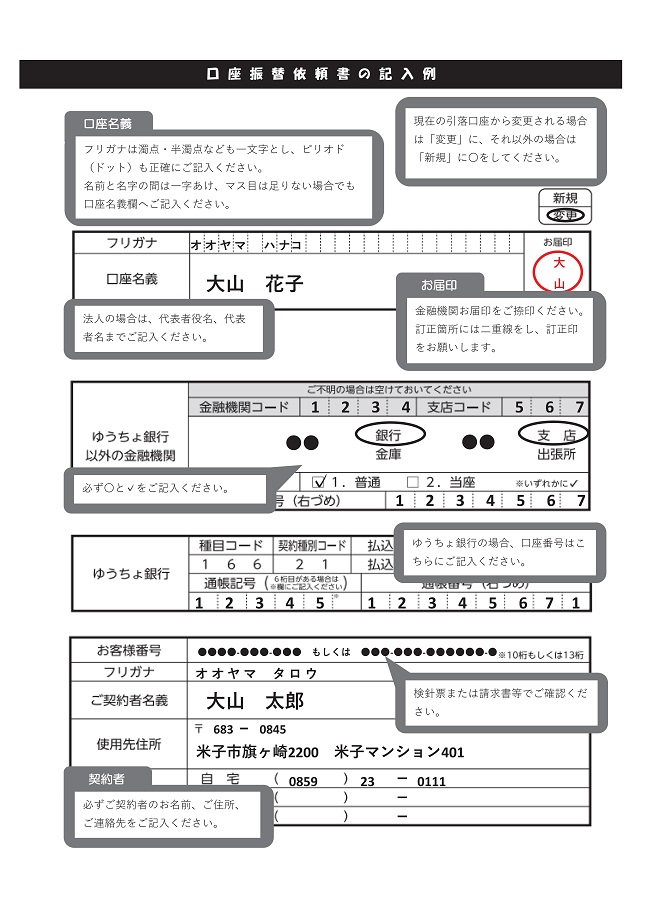 当社指定の口座振替依頼書をご記入いただくか、取扱金融機関の窓口でお申し込みいただきます。
