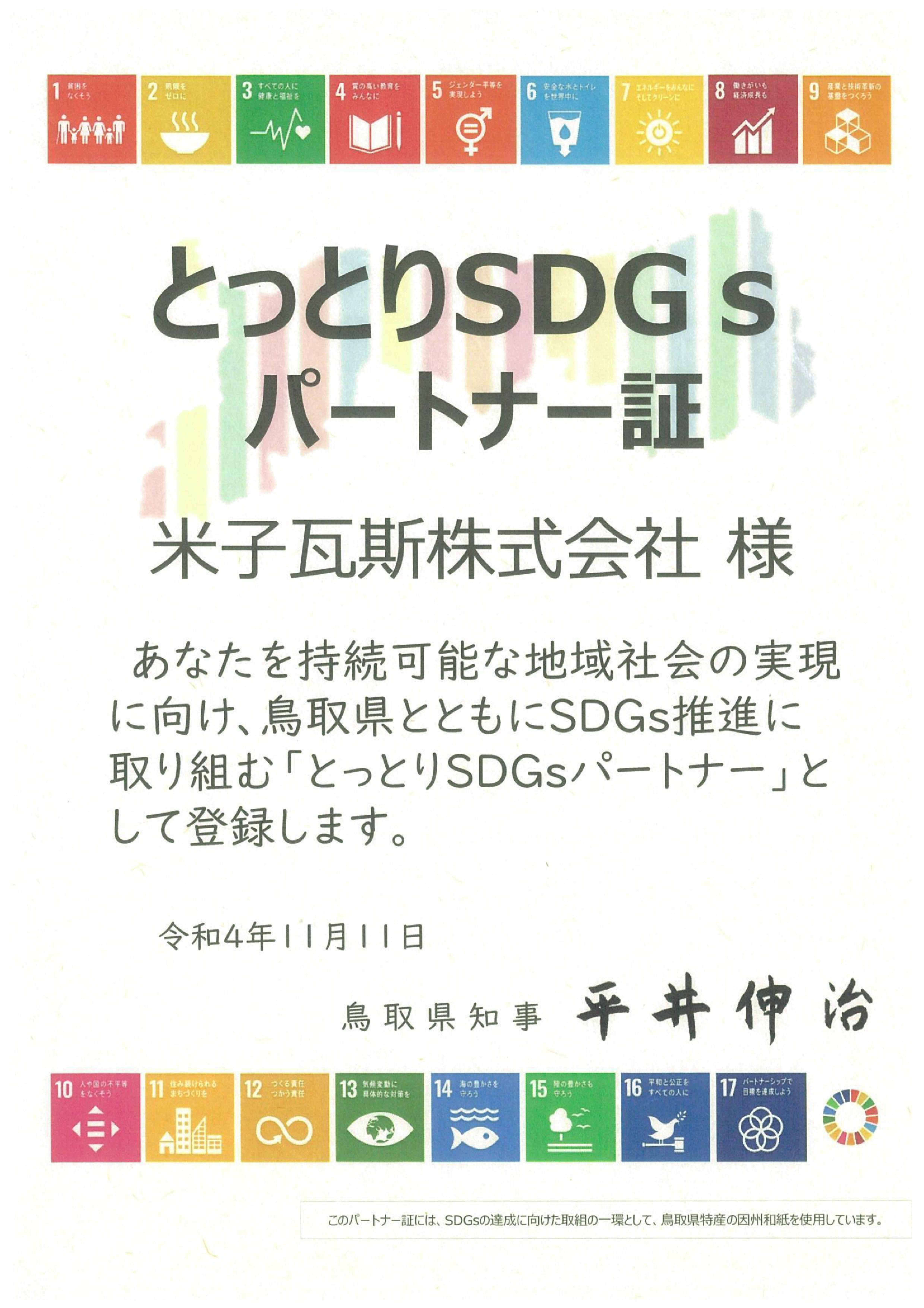 この度弊社は、「とっとりSDGsパートナー」に認定されました。