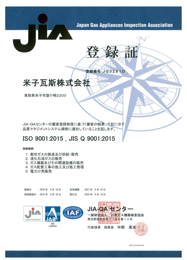 | このたび当社は、品質マネジメントの国際規格である「ISO9001」の認証を取得いたしました。 お客様の安心・安全を守るために仕事の品質を向上させ、快適な暮らしに貢献し続けていけるよう社員一丸となって努力してまいります。 ・取得サイト 米子瓦斯株式会社 ・取得までの経緯 2014年10月 キックオフ 2015年4月 運用開始 2015年7月 第一段階審査 2015年8月 第二段階審査 2015年9月24日 認証取得 2018年9月24日 更新 2021年9月24日 更新 2024年9月24日 更新 |