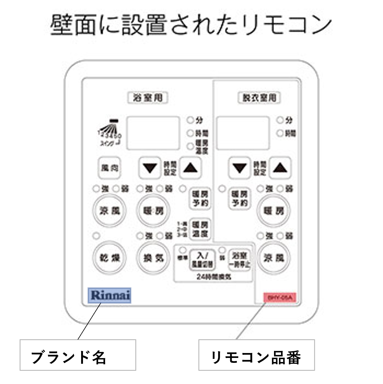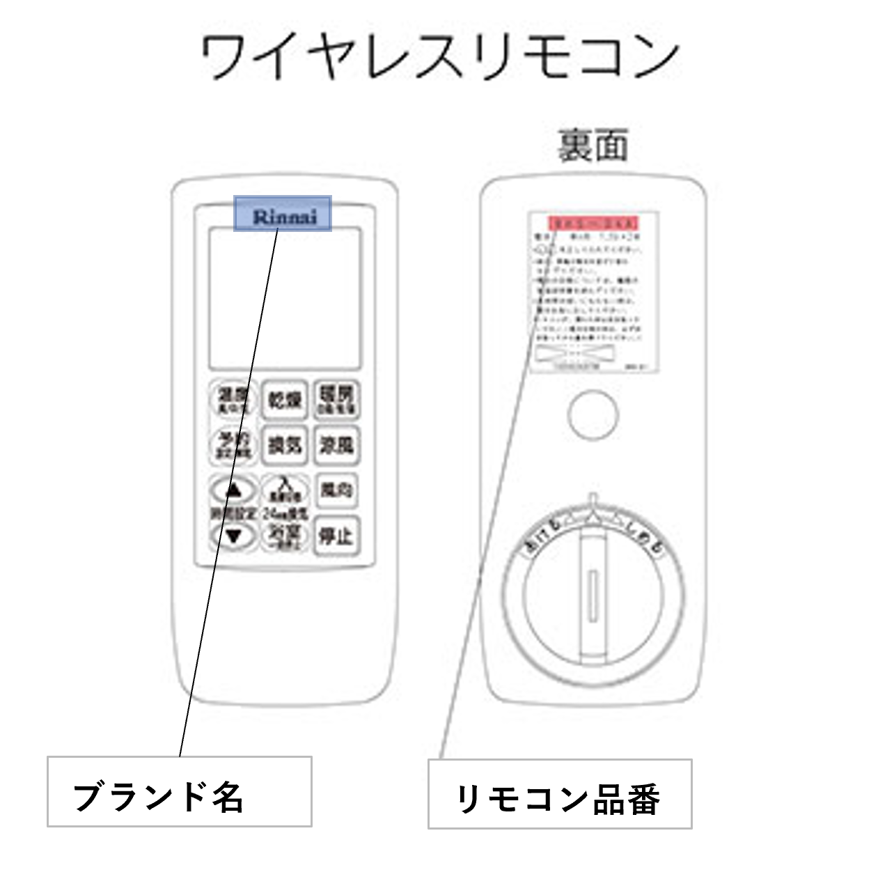 製品本体は浴室の天井に設置されております。脱衣所等に併設されたリモコンから「ブランド名」と「リモコン品番」をご確認ください。