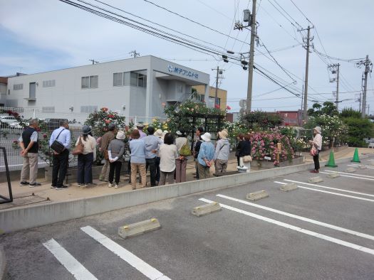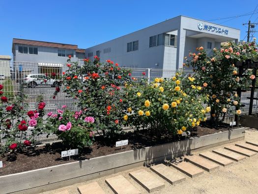 バラ園は弊社正門のすぐ左側で、道路と駐車場の間にございます。