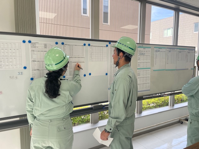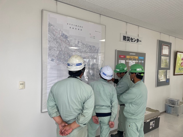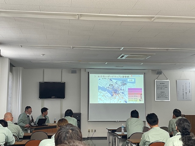 第2部では、過去実際に米子市で発生した地震とその被害規模、当社としてどのような対応を行ったのかを座学を通して学びました。また、米子市のハザードマップと当社の都市ガス導管網を重ねることで、どの地域が危険であるかなども全員で共有することができました。
